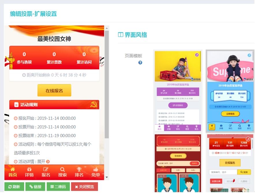 看到这里,有的用户觉得这个投票的模板,有点太白,看起来是非常的不美观,就想要搞定这一系列的模板情况。其实我们看到,在线投票网站模板的设置操作,还是很简单的。需要用户点击右侧的界面风格,就会发现这里有很多个的风格模式。