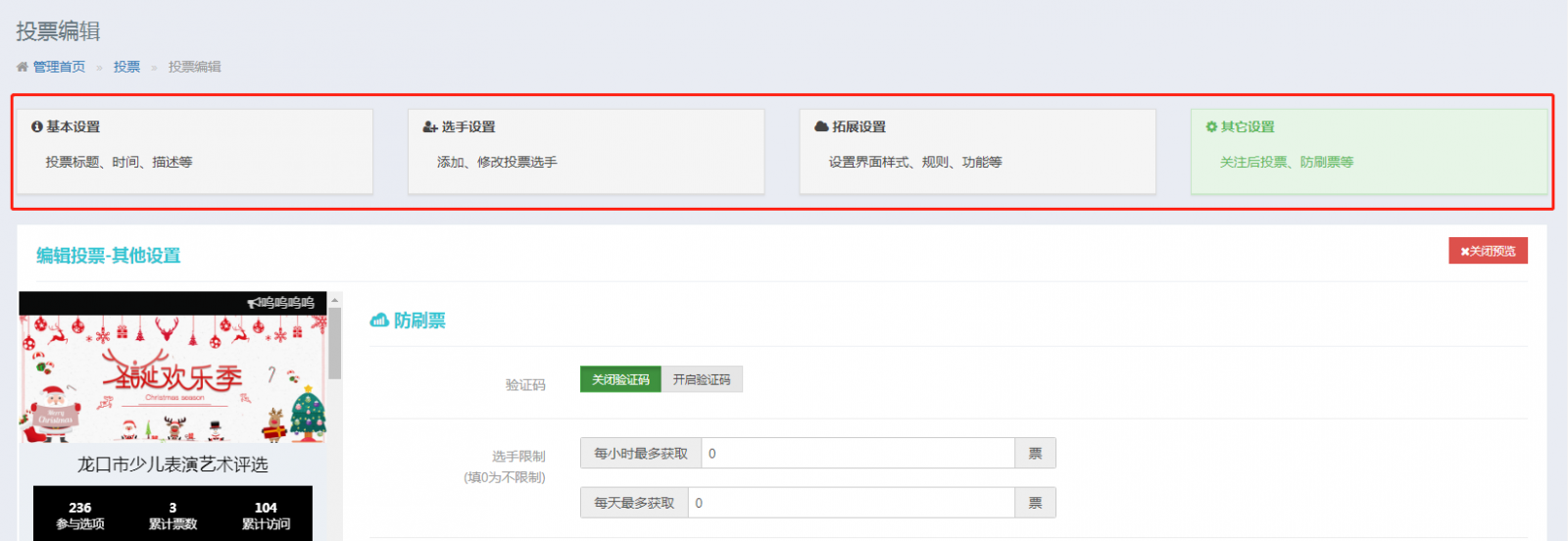 除去上述,我们还有一个微信分享功能。这个功能也非常的有意思,如果你的这个投票 模式需要到推广,我们只需要开启这个功能就好了。通过设置这些操作,用户投票的时候就比之前更容易更简单。
