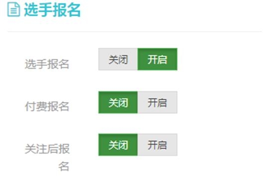 这完全是根据用户自身的需求进行操作,也或者是您不太满意这个免费报名设置,所以我们在这里,就可以点击关闭,或者是点击开启报名一样,也或者是您可以开启这个关注之后再进行报名,总之这个选手报名,这里就有三个选项,完全是根据用户的需求进行选择的。